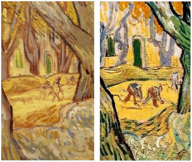 Above on the left is a picture I took at the Cleveland Museum of Art of The Large Plane Trees because I am fortunate enough to live in the same city as that piece. On the right is the same section of The Road Menders, which he painted later in the studio, using his earlier painting as a guide. I’ve written before about how much I love The Large Plane Trees because of its passion and very obvious need to capture the moment before it disappeared. He had to catch the colors of the leaves changing and was so desperate to do so that he used a tablecloth rather than wait for canvases to be delivered. There are places where you can see the pattern of the cloth beneath because portions of the painting were left as rough sketches to be returned to later.